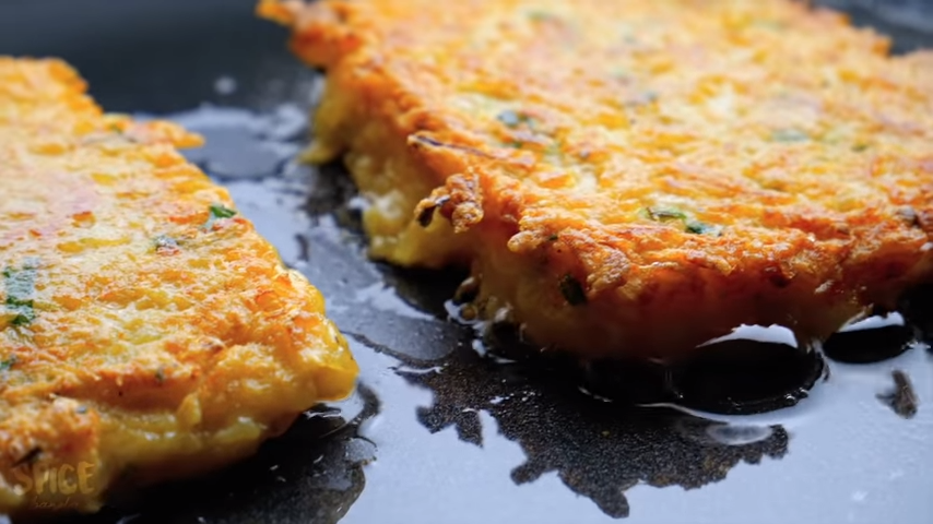 Krompimpirje Naribaj in jih operi v hladni vodi. Ožemi. Dodaj moko, sir, jajce, na majhno narezano čebulo, česen, koriander, sol, rdeči čili, poper. Mešaj. Ko je dovolj prepojeno, dajaj na srednje vroč ogenj žliške zmesi in jih oblikuj v pravokotnike. Peči vsako stran 4 minute.